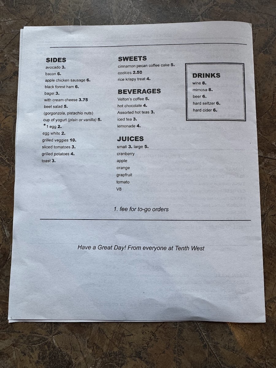 Tenth West has garnered a loyal following, supported by glowing reviews from satisfied customers. One visitor, Marcel Marculescu, shared their experience: “We've enjoyed breakfast here every day for the past week, and it’s been amazing each time!” It’s clear that both locals and travelers find solace in Tenth West’s consistency and quality. Another patron, Cathy H, praised the personalized service and the delicious special she enjoyed, which included avocado, spinach, and a delightful garlic and cheese scramble.